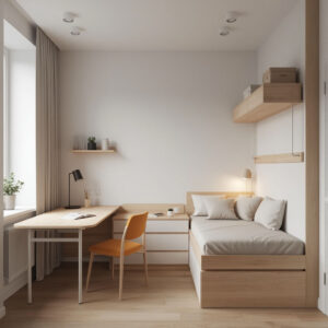 Для спальни подойдёт кровать с встроенными ящиками под матрасом. Это избавляет от необходимости в отдельном комоде. Если места совсем мало, рассмотрите шкаф‑кровать: днём она складывается в нишу, превращаясь в шкаф, а ночью опускается, образуя спальное место.